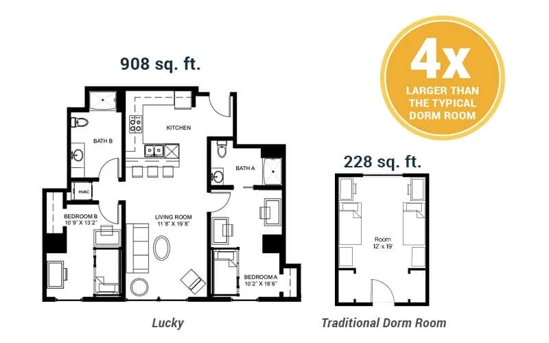 That hasn’t ended — it’s simply evolved. Dorm@Lucky is now part of Lucky Apartments, and its spirit lives on through the Foundation floor — designed for students who want more freedom and flexibility in their lease terms.
